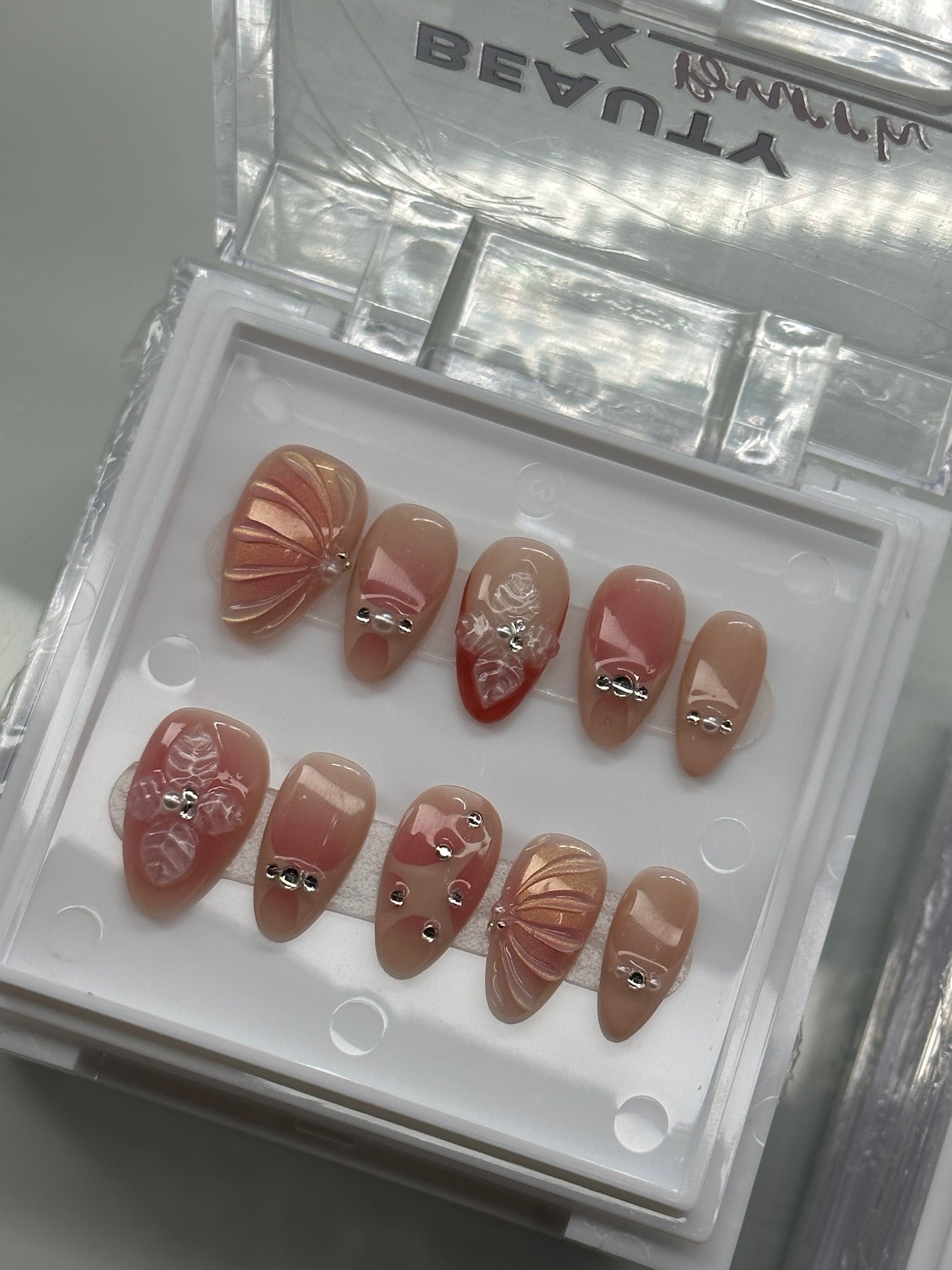 Included: 10 nails 3D designs, rhinestones and pearls Nude base + pink accents Shiny top coat Short Almond Application kit